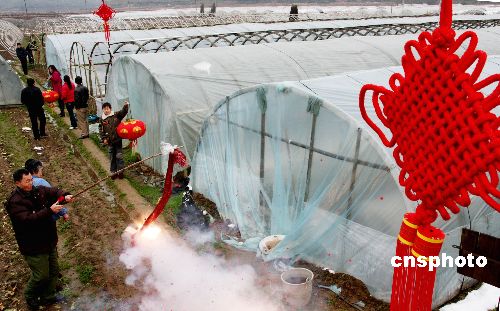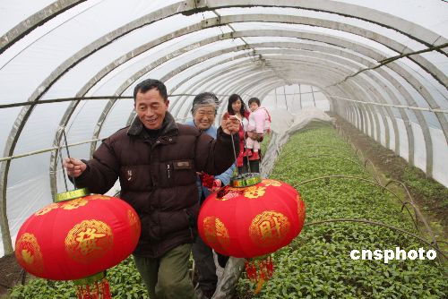 1月30日,離春節僅有一周,江西德興市張村鄉千畝無公害蔬菜基地的菜農們在遭遇了今年大雪和寒凍后,在自家的蔬菜大棚掛起了紅紅的中國結和燈籠,鳴放鞭炮,呈現一片歡喜和諧的氣氛,給即將到來的新春佳節增添了濃濃的喜慶。中新社發 卓忠偉 攝