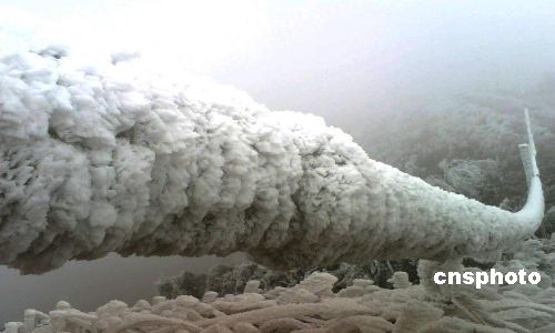 中國廣西最近遭遇嚴重雨雪冰凍災害,電力、通訊設施受到嚴重影響,圖為中國移動廣西公司在柳州市融安縣一個超負荷的移動光纜被冰雪凍結。中國移動廣西公司已啟動最高等級應急通信方案,全力保障通信網絡暢通,向重災區提供信息發布綠色通道和延遲停機等服務,為抗災救災提供通信保障。中新社發 申蓓 攝