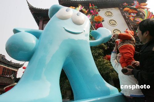 2月4日,2010世博會吉祥物“海寶”首座雕塑亮相申城,吸引了眾多市民的目光。該座雕塑由玻璃鋼材質制成,高3.5米,寬2.3米。中新社發 湯彥俊 攝