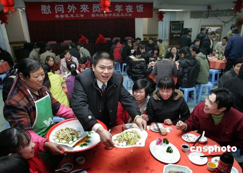 2月4日晚,在福州市福興投資區務工的老陳喜洋洋地在食堂端上熱騰騰的美食,和工友一起提前吃上了一頓豐盛的年夜飯。老家湖南的他今年因暴雪無法回家過年,據了解,福州僅晉安區像老陳這樣的滯留外來工有5000多人,當地政府和工會組織近期陸續為區內滯留外來工準備了600余桌的年夜飯,讓不能回家的農民工兄弟感受到在福州過年的溫暖。中新社發 包華 攝