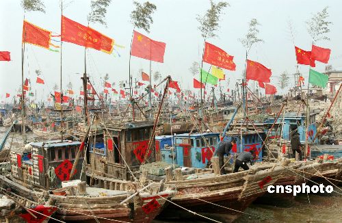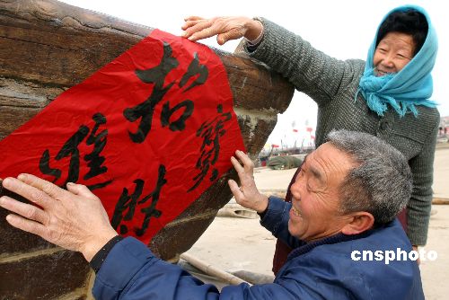 2月5日,在連云港市沿海漁村,漁民們沿襲傳統的漁家過年習俗。春節前,漁民在漁船上掛紅旗、貼財神、放鞭炮,插上寓意“搖錢樹”的毛竹,以祈福納祥,祈求來年新春漁業豐產豐收。中新社發 王健民 攝