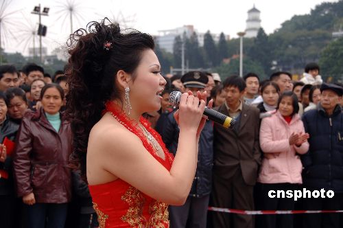2月8日,福州市文化部門在五一廣場舉行了“榕城祝!蔽膴恃莩,來自山東省的務工者畢君上臺表演,祝福留在福州過春節的外來民工新春愉快。中新社發 鄭祚聲 攝