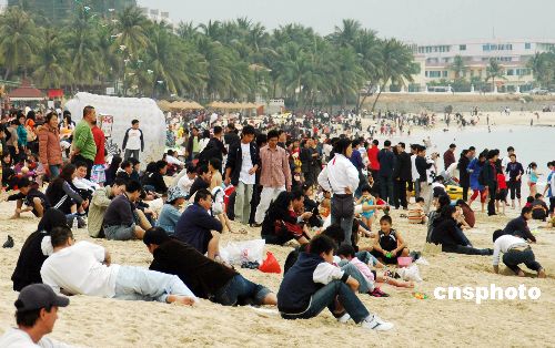 2月10日,春節假期已過半,海南三亞各大景區游人仍絡繹不絕,場面十分火爆。圖為人山人海的三亞大東海景區。中新社發 尹海明 攝