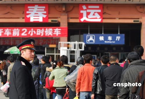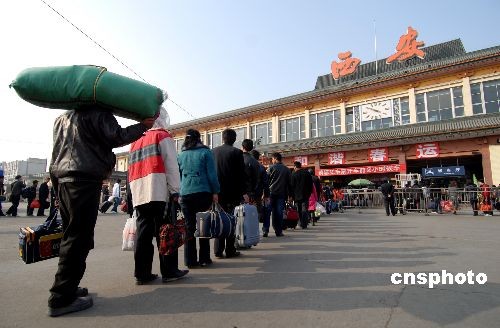 2月19日,旅客在西安火車站排隊有序進站乘車。元宵節(jié)將至,外出民工與返校學(xué)生流、探親流等客流全面啟動,西安火車站客流持續(xù)攀升。鐵路部門采取提前二小時進站、在廣場設(shè)立臨時候車區(qū)等措施,做好旅客乘車組織及服務(wù)工作,確保客流高峰安全、平穩(wěn)、有序。中新社發(fā) 唐振江 攝