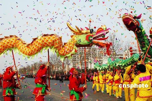 2月20日,山東淄博周村區舉行元宵節民間藝術文藝匯演,震天的鑼鼓、歡快的秧歌、威武的獅子、翻飛的龍燈以及劃旱船、抬芯子、跑竹馬等民間藝術形式一一上演,讓人們熱熱鬧鬧過元宵。中新社發 董乃德 攝