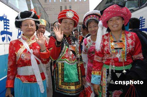 三月二日,云南少數民族代表盛裝抵達北京,出席將于五日開幕的第十一屆全國人大一次會議。中新社發 王東明 攝