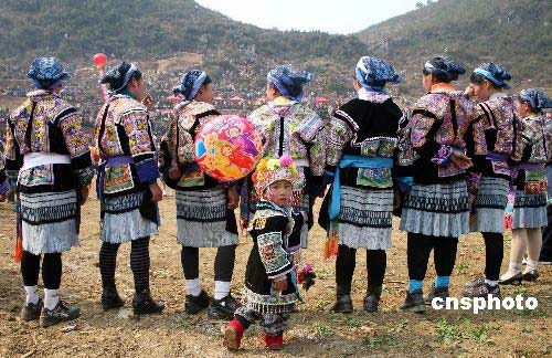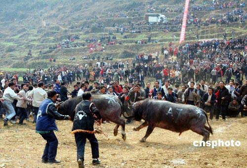 3月2日,2008貴州省開陽縣高寨苗族布依族鄉平寨斗牛節揭幕。來自十里八鄉的苗族、布依族同胞身著節日盛裝,聚集平寨村天然的斗牛場,吹起蘆笙,載歌載舞,一睹斗牛賽、斗雞、撥河、苗族舞蹈、刺繡、紡織等比賽的精彩表演。中新社發 pengnian 攝