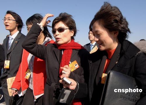 三月三日下午,中央電視臺新聞聯播主持人李瑞英(右二)、海霞(右一),在北京出席全國政協十一屆一次會議開幕會。中新社發 王東明 攝