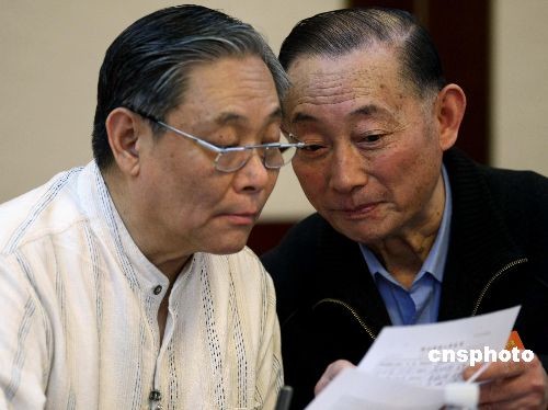 3月5日下午,全國政協(xié)十一屆一次會議進(jìn)行政府工作報告小組討論,梅蘭芳大師之子梅葆玖(右)與京劇名家張學(xué)津參加文藝小組討論。梅葆玖任北京京劇院梅蘭芳京劇團(tuán)團(tuán)長。張學(xué)津是北京京劇院一級演員。中新社發(fā) 盛佳鵬 攝
