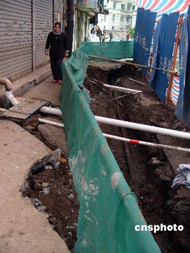 3月21日,湖北宜昌城區力行二街35號8層高的住宅樓豐澤苑地基發生陷塌后的現場,施工方已將陷塌物部分清理后準備對地陷進行加固。據悉,3月19日晚,宜昌城區力行二街35號8層高的住宅樓豐澤苑地基突然發生陷塌,一些居民連夜撤離;陷塌處長約10多米,寬約5米。居民們認為,豐澤苑住宅樓5米外的地方有一塊正在開發的地基已挖了10多米深,正因這處較深的地基與豐澤苑住宅樓地基太近,才導致出現了陷塌險情。豐澤苑住宅樓于2001年建成,住有40多戶居民(其中,一樓為商業門面),一個多月前,塌陷處的表面就已發現裂縫,施工人員曾對裂縫處作過灌漿處理。中新社發 劉君鳳 攝