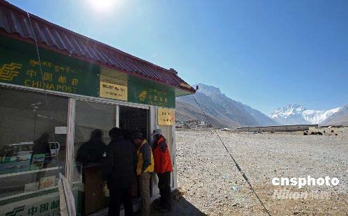 4月29日,位于西藏珠峰大本營(yíng)絨布新聞中心的中國(guó)珠穆朗瑪峰臨時(shí)郵政局,不少采訪(fǎng)北京奧運(yùn)會(huì)火炬接力珠峰展示活動(dòng)的中外記者前來(lái)購(gòu)買(mǎi)具有珠峰特色的北京奧運(yùn)會(huì)紀(jì)念品。中新社發(fā) 盛佳鵬 攝