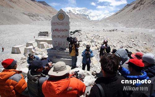 4月30日,北京奧運(yùn)會(huì)倒計(jì)時(shí)100天,受邀采訪2008北京奧運(yùn)會(huì)火炬接力珠峰展示活動(dòng)的中外媒體記者,集體在珠峰大本營(yíng)探營(yíng)。圖為他們?cè)谥榉宕蟊緺I(yíng)珠穆朗瑪峰高程測(cè)量紀(jì)念碑前集體進(jìn)行采訪。中新社發(fā) 盛佳鵬 攝