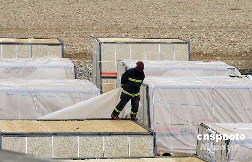 5月3日,大雪過后,在珠峰大本營絨布新聞中心,中外記者居住的簡易屋有漏水事故發生,為避免再次漏水,消防戰士為簡易屋披上“雨衣”。中新社發 盛佳鵬 攝