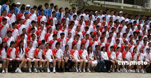 北京奧運(yùn)圣火即將進(jìn)入海南三亞開(kāi)始內(nèi)地傳遞。5月3日,將在三亞進(jìn)行圣火傳遞的二百多名火炬手聚集一堂舉行火炬手大會(huì),會(huì)后一起合影留念。中新社發(fā) 周兆軍 攝