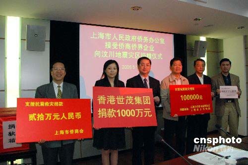 5月14日上午,上海僑商僑界企業(yè)向汶川地震災(zāi)區(qū)捐款一千萬(wàn)余元。其中,上海市僑商會(huì)會(huì)長(zhǎng)、世茂集團(tuán)董事長(zhǎng)許榮茂先生以世茂集團(tuán)名義向?yàn)?zāi)區(qū)抗震救災(zāi)捐款1000萬(wàn)元幫助災(zāi)區(qū)人民度過(guò)難關(guān)。在上海僑辦舉行的接受僑商僑界企業(yè)向?yàn)?zāi)區(qū)捐贈(zèng)儀式上,僑辦領(lǐng)導(dǎo)以及機(jī)關(guān)全體工作人員也向?yàn)?zāi)區(qū)紛紛捐款。中新社發(fā) 王江紅 攝