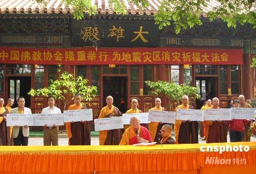 四川省汶川縣發(fā)生七點(diǎn)八級地震后,中國佛教協(xié)會十四日上午在北京廣濟(jì)寺隆重舉行消災(zāi)祈福大法會。現(xiàn)場賑災(zāi)捐款絡(luò)繹不絕,十一世班禪大師捐款十萬元人民幣。中新社發(fā) 徐長安 攝