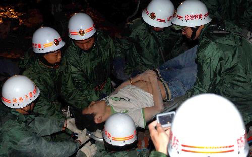 四川汶川縣5月12日發(fā)生7.8級地震后,北川縣北川中學(xué)受到極大的迫害,將近三千名的學(xué)生中僅有一半生存,另一部分學(xué)生因樓房倒塌而遇難或受傷。圖為抗震消防隊員不顧艱險連續(xù)工作,利用不同工具挖掘被壓人員,并及時成功搶救出一批學(xué)員。中新社發(fā) 鄒憲 攝