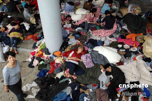 五月十五日,從四川綿陽北川羌族自治縣等災區救出的地震災民被安置在成都九洲體育館救助站接受救助,高峰期該救助站曾有三萬余名災民聚集。中新社發 陳文 攝