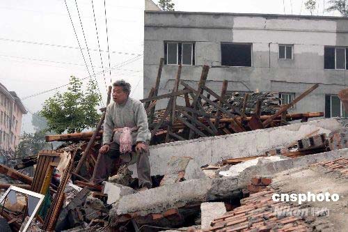 四川大地震,從都江堰到汶川縣映秀鎮(zhèn)沿線民房和交通受損嚴重,許多受困的居民紛紛離家趕往安全地點,也有許多居民想回家看往地震區(qū)的親人。圖為14日 ,一直堅信老伴還活著的居民在自家的廢墟前等待救援。中新社發(fā) 黃榮 攝