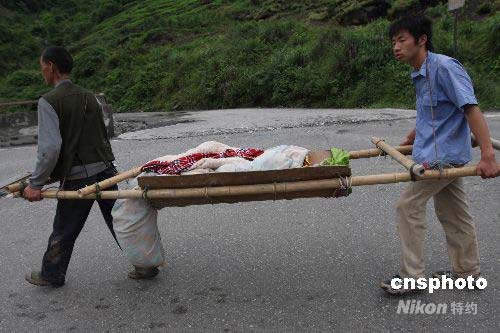 四川大地震,從都江堰到汶川縣映秀鎮(zhèn)沿線民房和交通受損嚴(yán)重,許多受困的居民紛紛離家趕往安全地點(diǎn),也有許多居民想回家看往地震區(qū)的親人。圖為14日,友誼隧道附近的災(zāi)民把受傷的孩子運(yùn)往外面進(jìn)行醫(yī)治。中新社發(fā) 黃榮 攝