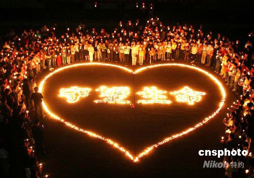 5月15日晚,山西省太原市雙語實驗小學400多名師生在校園操場上,將3000余支蠟燭擺成一個巨大的“心”和“守望生命”四個字,為四川災民祈福。中新社發 華山大 攝
