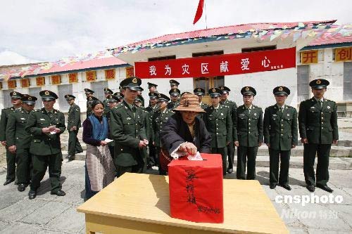 5月16日,駐守在海拔4500多米的青藏兵站部某大站黑河兵站官兵拿出津貼向四川災區(qū)民眾獻上一份愛心。兵站的藏族職工索朗嘎姆、加里等也加入了捐款行列。中新社發(fā) 鄒小慶 攝
