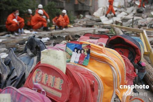 5月15日,在四川省什邡市紅白鎮中心小學廢墟旁,河南省消防總隊抗震救災突擊隊的搜救人員將找到的孩子們的書包整齊排放,等待家長認領,以告慰生者。其中一個書包上還放著一張孩子們的照片。 中新社發 張曉理 攝