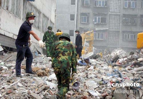 五月十七日,是汶縣地震發(fā)生時(shí)間第六天,地震災(zāi)區(qū)都江堰市最大的市場荷花池市場已開始用大型挖掘機(jī)、裝載機(jī)清理倒塌的樓房和廢墟,并有專業(yè)人員進(jìn)行防疫消毒。中新社發(fā) 周丹鈺 攝