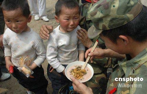 一對被從安縣高川鄉解救出來的雙胞胎兄弟還未從地震的震撼中回過神來,嘴里不停叫著媽媽。中新社發 肖青 攝