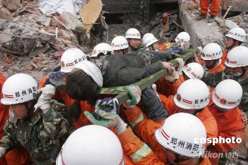 5月17日18時(shí)18分,四川省什邡市鎣華鎮(zhèn)鎣華實(shí)業(yè)有限公司31歲女工卞剛芬在震后本廠綜合大樓廢墟下被埋124小時(shí)后,經(jīng)河南消防搶險(xiǎn)救援突擊隊(duì)連續(xù)31小時(shí)的艱苦營救后奇跡生還,她意識(shí)清醒,對(duì)周圍的人們說著“感謝”。中新社發(fā) 張曉理 攝
