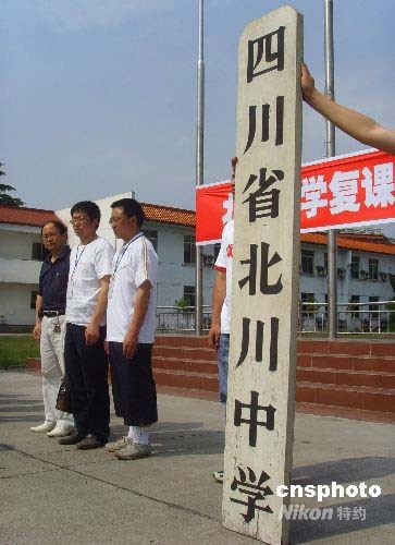 復課儀式上,北川中學的校牌由師生手扶重新屹立。中新社發 霍潺 攝