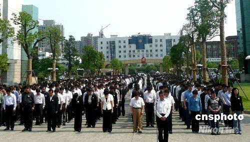 5月19日, 揚州市委、市人大、市政府、市政協(xié),各區(qū)委、區(qū)政府及市直有關部門下半旗,沉痛哀悼四川地震遇難同胞。14時28分起,全市人民默哀3分鐘,汽車、火車、船舶鳴笛,各防空警報點防空警報鳴響。在全國哀悼日期間,停止公共娛樂活動,開展一系列的哀悼活動,以表哀思。截至18日晚,揚州市募集賑災捐款突破千萬元人民幣。圖為揚州市政府大院全體工作人員胸佩白花集體列隊默哀。中新社發(fā) 崔佳明 攝