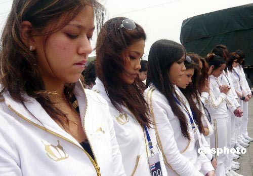5月19日14時28分,為表達(dá)中國各族人民對四川汶川大地震遇難同胞的深切哀悼,中國國務(wù)院決定,2008年5月19日至21日為全國哀悼日。圖為正在中國廣西參加2008亞洲超級模特大賽的各國選手向四川汶川大地震遇難者默哀。中新社發(fā) 錢興強(qiáng) 攝