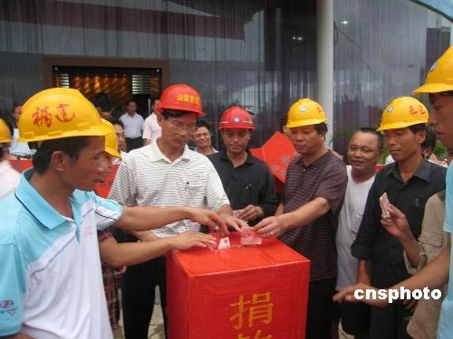 5月19日下午,海南文昌一家工地的渝、湘籍農民工,自發組織為四川汶川地震受難者默哀3分鐘,隨后為災區同胞捐款獻愛心。圖為農民工慷慨解囊為災區捐款。中新社發 付美斌 攝