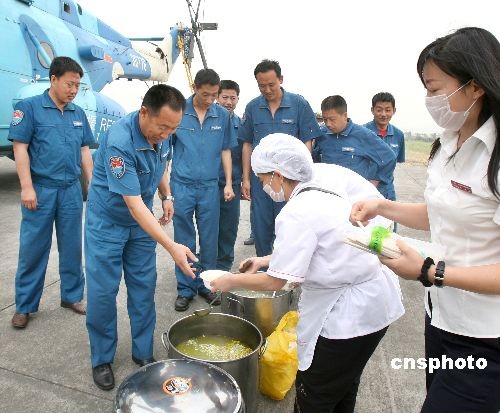 5月20日,成都市某企業職工給戰斗在抗震救災一線的南空某團官兵送在熱氣騰騰的老鴨湯。