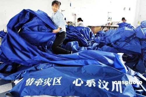 5月20日,浙江杭州一雨具制品廠的女工們?cè)谌找冠s制災(zāi)區(qū)急需的救災(zāi)專用帳篷。據(jù)了解, 該廠急災(zāi)區(qū)所急,放棄其他雨具生產(chǎn),每天開足馬力生產(chǎn)帳篷,產(chǎn)量達(dá)300頂,比平時(shí)增加一倍,并實(shí)行微利銷售。目前已有2000多頂救災(zāi)專用帳篷送往四川、陜西等地震重災(zāi)區(qū)。