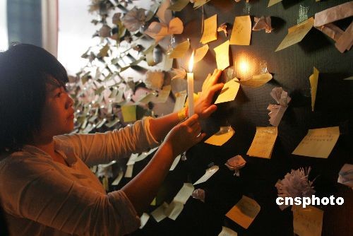 在五月十九日到二十一日為期三天的全國哀悼日里,福州寶龍廣場上豎立的兩面以黑色為背景的哀思墻前,許多市民紛紛駐足,悼念四川汶川特大地震遇難同胞。圖為哀悼墻上貼滿人們寫下祝福的紙片、紙花,寄托哀思。中新社發 小小 攝