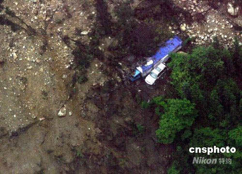 五月二十一日,在重災區映秀鎮外圍上空隨處可見塌方公路上汽車遇險時驚險萬分的情景。中新社發 賈國榮 攝