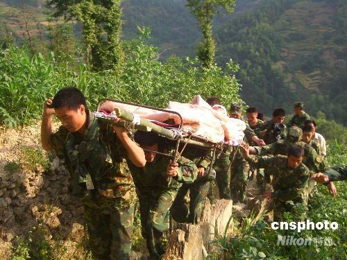 濟南軍區某摩步師黨員突擊隊跋山涉水轉移傷員。中新社發 魏國 攝