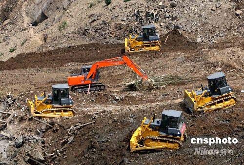 5月26日11時許,俄羅斯米—26大型運輸機運送的大型機械在四川唐家山堰塞湖排險。據悉,他們將24小時不間斷工作。中新社發 趙振清 攝