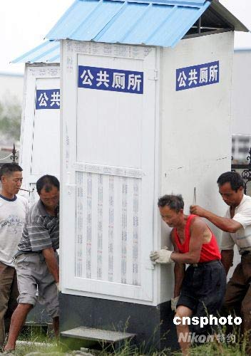 5月26日,都江堰市安置“5·12地震”受災民眾營地開始修建清潔公共衛生間,為居住在這里的人們提供良好的衛生環境。中新社發 任晨鳴 攝