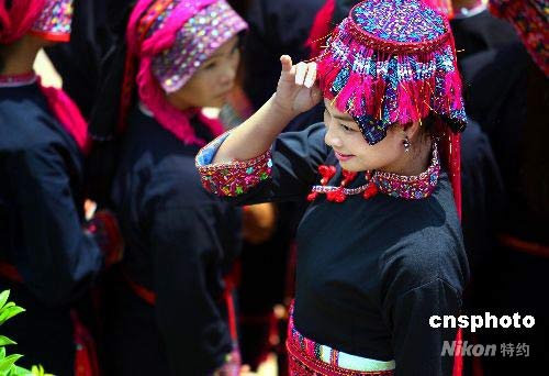一位海南五指山苗族姑娘,5月下旬在村寨向游人展示民族服飾,宣傳民族文化。當?shù)卣谕诰蛏贁?shù)民族傳統(tǒng)文化、利用原生態(tài)的自然環(huán)境條件,發(fā)展旅游業(yè),振興家鄉(xiāng)經(jīng)濟。中新社發(fā) 宋吉河 攝