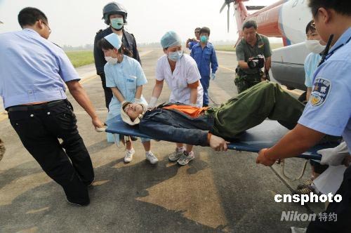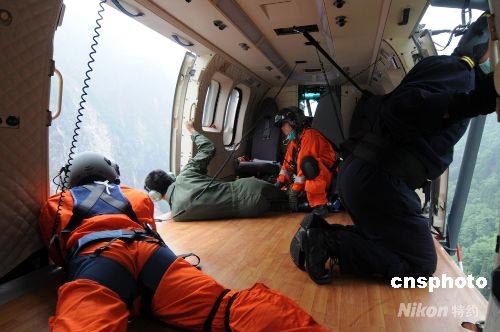 干溝電站地勢險峻,四周高山環(huán)繞,由于塌方嚴(yán)重,亂石堆砌,惡劣的環(huán)境給救助直升機(jī)實(shí)施救助帶來極大的困難。直升機(jī)離最近的懸崖不到5米。機(jī)長李嘉只能將直升機(jī)從200米高空緩緩地一點(diǎn)點(diǎn)往下降,最后穩(wěn)穩(wěn)地懸停在30米高空。B-7125救助直升機(jī)立即進(jìn)入救助模式,絞車手迅速拉開機(jī)艙,救生員緊握著鋼纜,躍出艙門,從30米的空中降下。此時,被困16天的4名被困人員從山溝里爬到救援點(diǎn),救生員李春林迅速用救援套將一位傷員套好,然后頂著直升機(jī)旋翼產(chǎn)生的大風(fēng),抓緊鋼纜,又空中搖晃了十幾圈,終于把第一位傷員救上直升機(jī)。緊接著,另一位救生員楊建輝也降落在地面上,他用救援套將兩名傷員一起救上直升機(jī)。隨后,楊建輝再次躍出機(jī)艙,迅速來到重傷員尚征林身邊。楊建輝用盡全身力氣把他套好,然后緊抱著他,抓緊鋼纜,一起被拉上直升機(jī)。經(jīng)過10多分鐘的緊急救援,4名傷員都成功救上直升機(jī)。