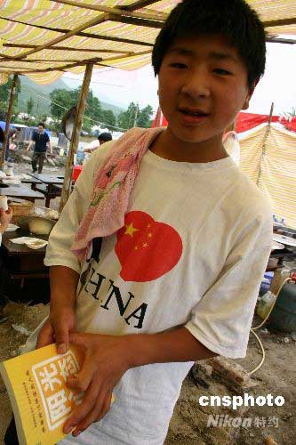 5月28日,在四川汶川大地震重災區之一的彭州,尚未復課的小魚洞小學學生楊青科,拿著一本《陽光心態》的書翻看,樂觀面對震后生活。中新社發 楊杰 攝
