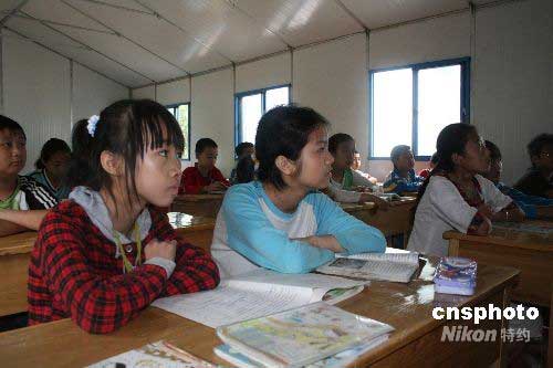 5月29日,文縣碧口小學學生在剛剛建成的抗震希望小學活動板房里上課,這是甘肅省重災區(qū)隴南在廢墟上建成的第一所災區(qū)希望小學。由共青團甘肅省委和甘肅省青少年基金會募集資金100多萬元建成的學校,共搭建活動板房教室22間1320平方米,可容納全校1200多名學生上課。中新社發(fā) 劉二銀 攝
