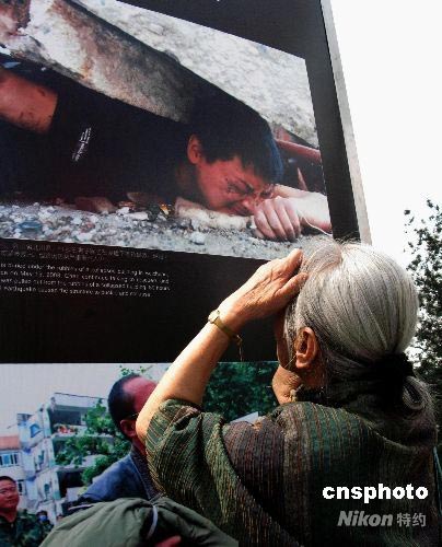 5月31日,北京王府井新華書店前,一名老人仔細觀看百名攝影家抗震救災攝影展,一名四川省北川羌族自治縣的男子被壓在廢墟下等待救援的圖片,深深震撼了老人。此圖片是新京報記者郭鐵流5月15日在四川北川拍攝的。中新社發 鄒憲 攝