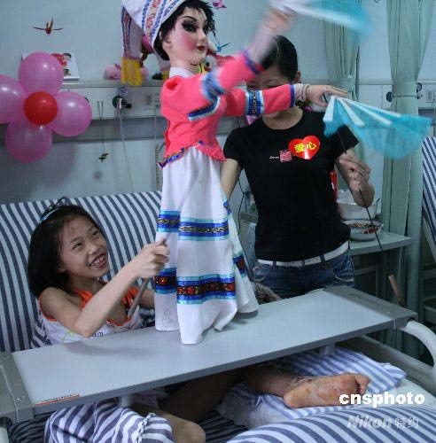 六月一日,一名來自四川地震災(zāi)區(qū)的小傷員快樂地和志愿者表演木偶劇《劉三姐》,齊唱廣西山歌。當天,在廣西人民醫(yī)院接受治療的十五名四川小傷員歡樂度過“六一”兒童節(jié),醫(yī)院人員、志愿者、市民紛紛給小傷員送來禮物共慶節(jié)日。中新社發(fā) 林艷華 攝