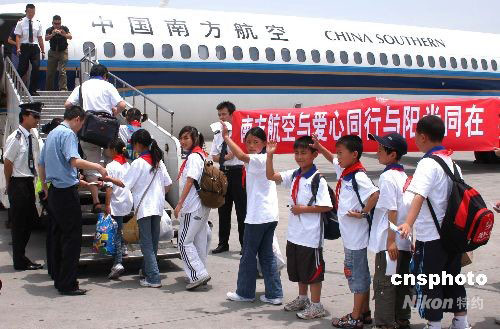 6月2日中午,成都雙流國際機場,89名來自北川、彭州、寶興、崇州等地震災區(qū)失去親人的兒童,乘坐南方航空海南分公司的愛心專機前往海南三亞,進行為期半個月的“愛心呵護、陽光行動”心靈呵護之旅。他們中年齡最大的16歲,最小的8歲。中新社發(fā) 尹海明 攝