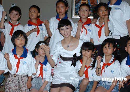 6月2日,89名來自四川北川、彭州、寶興、崇州等地震災(zāi)區(qū)失去親人的兒童飛抵海南三亞,進(jìn)行為期半個(gè)月的“愛心呵護(hù)、陽光行動(dòng)”心靈呵護(hù)之旅。港星翁虹當(dāng)天看望這些來自災(zāi)區(qū)的孩子,還與孩子們一起在當(dāng)晚舉行的瓊川兩地兒童聯(lián)誼晚會(huì)上表演節(jié)目。圖為翁虹與來自災(zāi)區(qū)的孩子們?cè)谝黄稹V行律绨l(fā) 尹海明 攝
