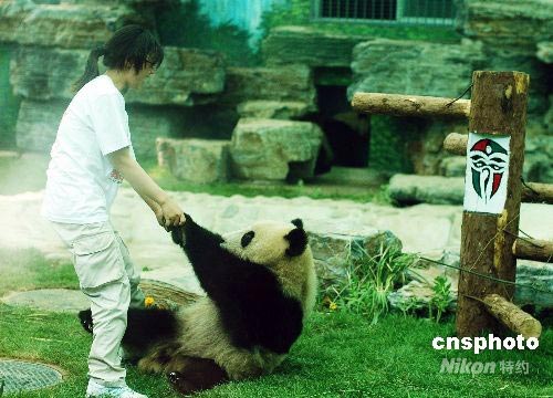 圖為在活動場里憨態(tài)可掬的大熊貓與飼養(yǎng)員“拔河”。6月5日上午,8只四川大熊貓首次與游客在北京動物園見面。他們憨態(tài)可掬十分惹人喜愛,頑皮的動作不時(shí)引得游客發(fā)出笑聲。這8只分別叫做翠翠、朵朵、美欣、鳳儀、淘淘、朗朗、歡歡、福娃的活波可愛的大熊貓分別住在面積為20多平方米的3間獸舍內(nèi),每間獸舍都安裝了空調(diào),室內(nèi)的溫度控制在大熊貓喜歡的25攝氏度左右,這使這些可愛的大熊貓感受到與四川臥龍家鄉(xiāng)一樣的環(huán)境。中新社發(fā) 筱瑋 攝